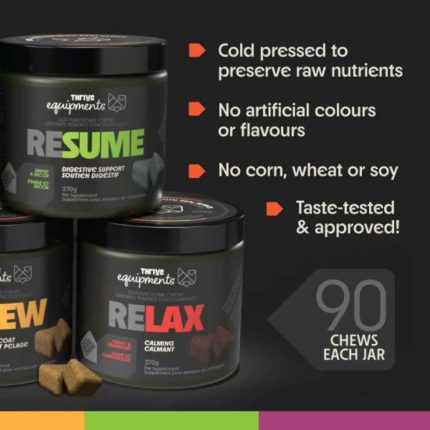 Soft functional supplement chews for dogs. Inspired by the idea of equipping our pets for a lifetime of wellness, through maintenance and prevention, Thrive "Equipments" function to support optimal health.