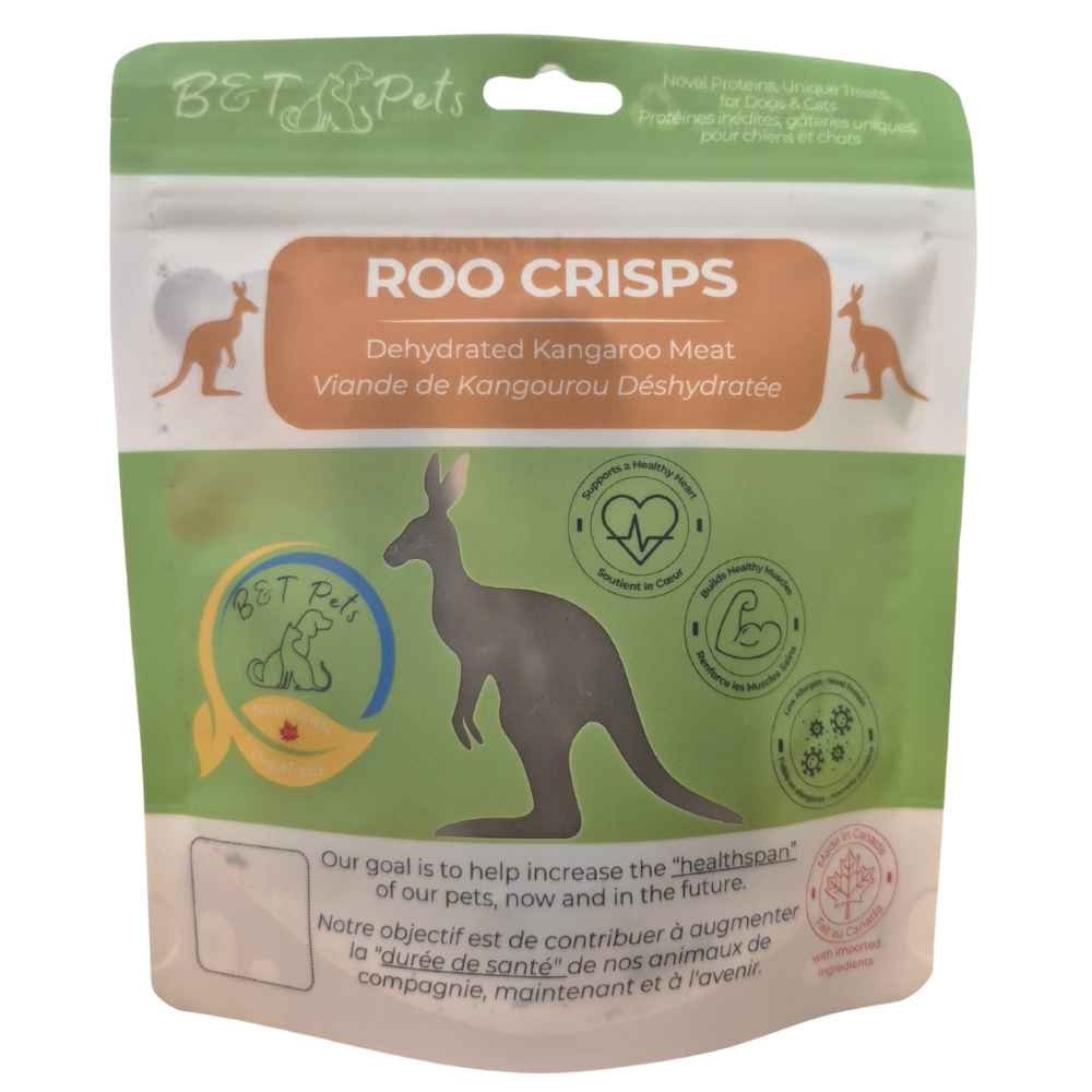 We craft our Kangaroo Crisps from free-range kangaroos that we harvest directly from the Australian outback as a single-ingredient treat. Dehydrated to human-grade standards in the B&T Pet kitchen, these protein-rich snacks are low in fat and packed with essential nutrients like iron, zinc, B12, and selenium. Ideal for dogs and cats with allergies or sensitive diets, Kangaroo Crisps support muscle health and energy, making them a nutritious, novel protein treat.