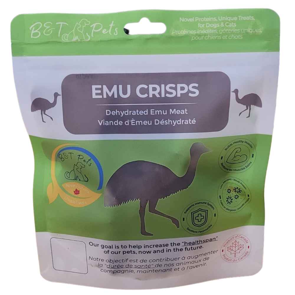 Our Emu Crisps feature 100% Canadian emu, which we ethically and sustainably raise in Southwestern Ontario as a single-ingredient treat. Dehydrated to human-grade standards, this lean, high-protein meat supports muscle health and is highly digestible, making it gentle on sensitive stomachs. Made in a human-grade facility and then finished in the B&T Pet kitchen, Emu Crisps are a clean and novel protein source. Therefore, they are ideal for both dogs and cats with sensitive diets.
