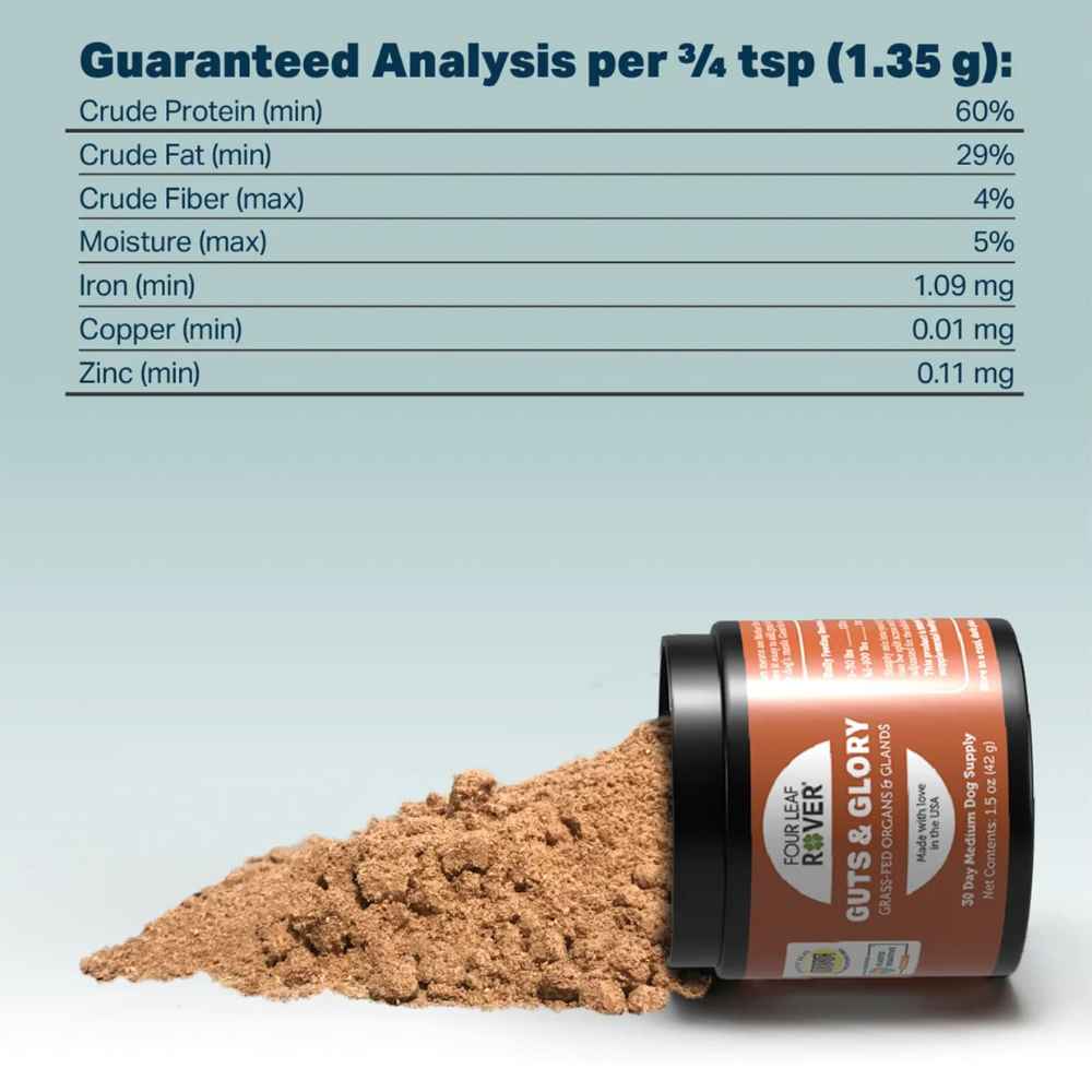 Four Leaf Rover Guts & Glory is organs made easy (even for picky eaters!) This powerful blend of New Zealand sourced beef organs is a convenient way to get more organ variety into your dog’s diet. After all, the organs are Mother Nature’s multivitamins.