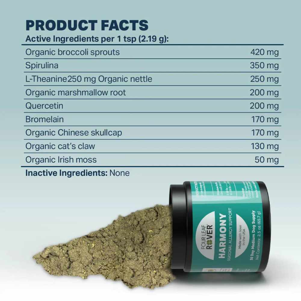Harmony is an exciting formulation that targets not just skin health, but all the organs that support healthy skin. It’s a veterinarian-formulated blend of skin and organ detoxifiers like broccoli sprouts and spirulina, proven performers like quercetin, L-theanine and Chinese skullcap to support a normal histamine response, along with soothing organic herbs.