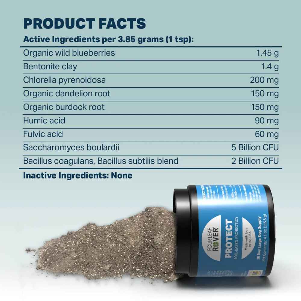 Four Leaf Rover Protect is the next generation of natural probiotics for dogs. A scientific blend of soil-based probiotics, probiotic yeast and detoxifying herbs and clays.