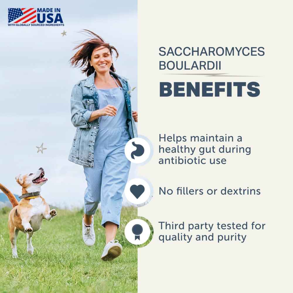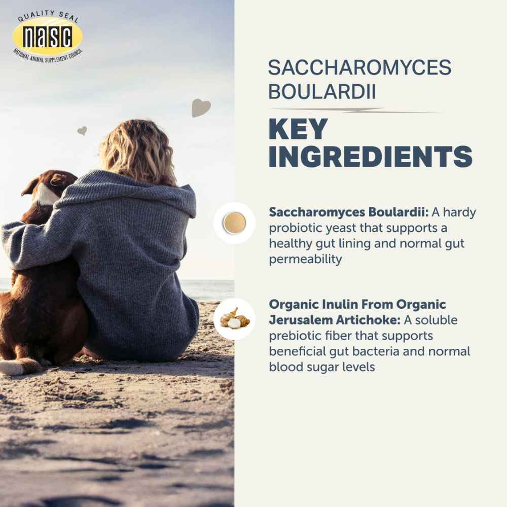 Yeast-based probiotics are unique because they’re not harmed by antibiotics, like other probiotics are. Studies show that it can help ease digestive upset during antibiotic use. This makes it the perfect choice for dogs being treated with antibiotics or other medicines that harm gut bacteria. It aids in maintaining a healthy gut lining with studies showing this strain of probiotic influencing parts of the immune system that maintain proper gut permeability.