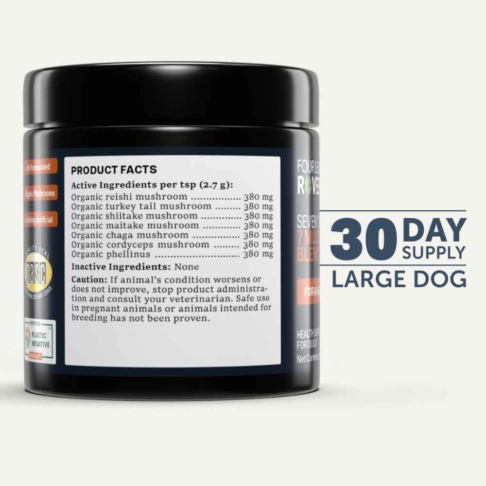 Four Leaf Rover Seven Shrooms is 100% whole, organic mushrooms for dogs is 3rd party tested to be high in immune-enhancing polysaccharides and beta-glucans.
