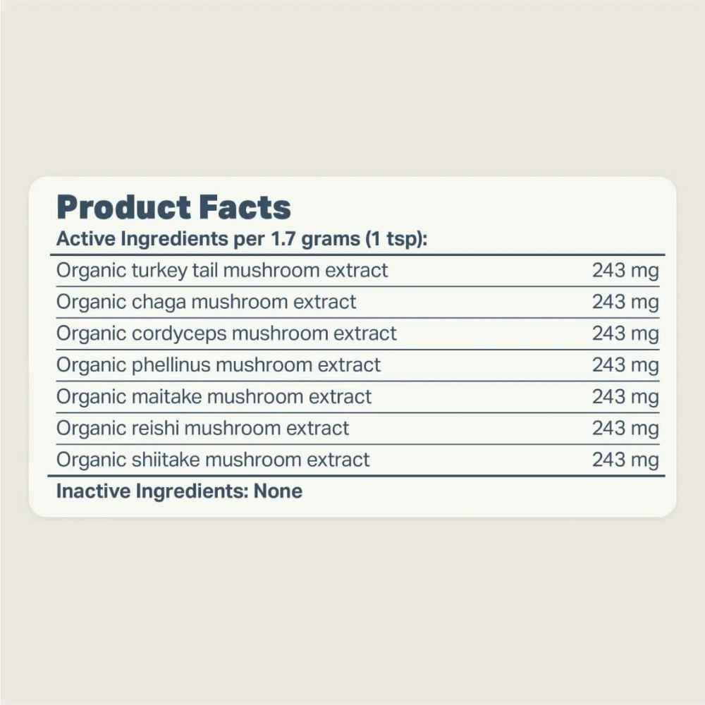 Mushrooms work best when they’re high in beta-glucans, which is why we use the entire mushroom, where most of the beta-glucans are found. They also like to work synergistically, which is why we’ve combined 7 powerhouse mushrooms in this super-premium mushroom blend.