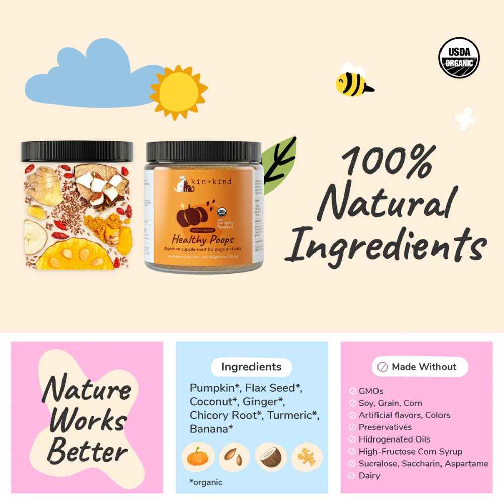 Featuring a blend of organic Ginger, Pumpkin, Coconut and Flax Seeds, Kin + Kind natural digestive supplement is bursting with fiber. Promoting bowel regularity and healthier stools, it helps keep dog and cat stomachs happy.