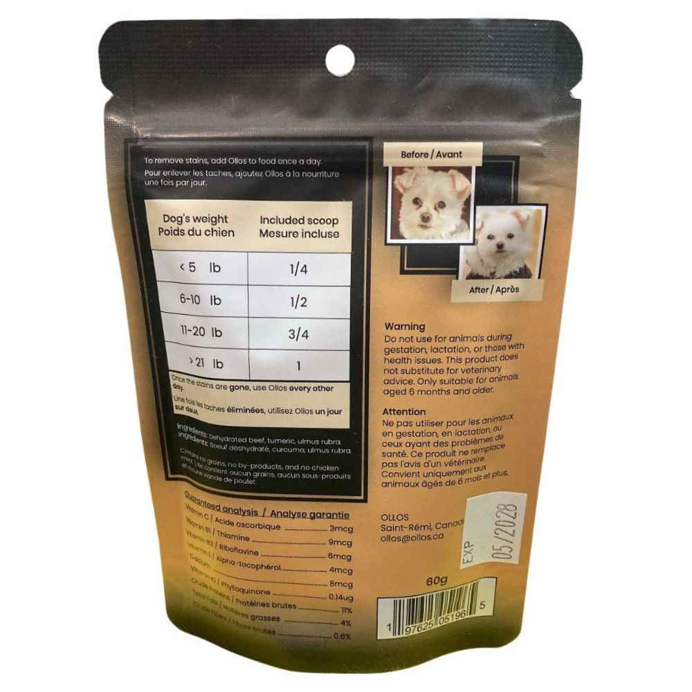 Ollos Tear Stain Prevention Powder – Ollos helps prevent stains caused by your pet’s tear by reducing mucosal oxidation and balancing their pH.