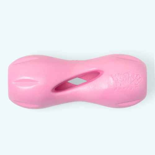 This award-winning toy was brilliantly designed to extend the life of expensive dog treats while keeping dogs busy. The side openings release scent and taste while the continuous interior hole allows treats to extend out. Flexible ridges grip multiple sizes of treats. One of our toughest dog toys, Qwizl is also fun to toss, fetch, and chew even after the treats are gone. Curved shape makes toy easy for dogs to hold in place with paws.