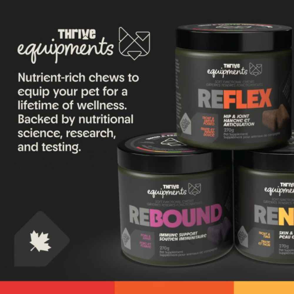 Soft functional supplement chews for dogs. Inspired by the idea of equipping our pets for a lifetime of wellness, through maintenance and prevention, Thrive “Equipments” function to support optimal health.