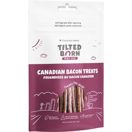 Who doesn’t love bacon?! Another favourite flavour by Tilted Barn Treats, Canadian Bacon, gives your pet access to 100% Canadian made, all natural pork that is a healthy, soft meaty treat. As always, our treats are preservative-free and contain no fillers or by-products. Our single-source protein treats are made with all-natural, high-quality, whole ingredients from the human food market sourced from across the Canadian Prairies, and are 100% Canadian-made. Our treats are available in 100g resealable packages.