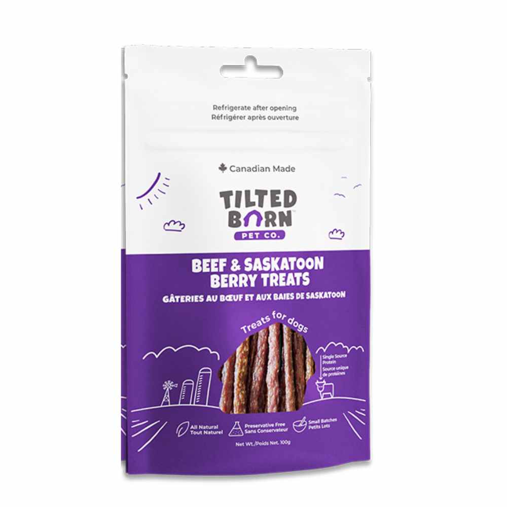 Tilted Barn Pet Co. Treats are healthy, soft meaty treats for dogs and cats of all ages and sizes. They are preservative free and contain no fillers or by-products. These single source protein treats are made with all natural, high quality, whole ingredients from the human food market sourced from across the Canadian Prairies, and are 100% Canadian made.